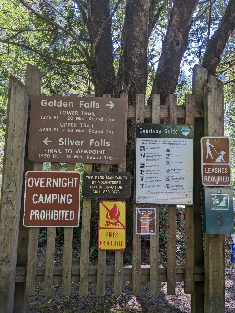 This weekend I visited the Golden and Silver Falls State Natural Area. This hiking area has a vault toilet and a couple of picnic tables at the trailhead. It is accessible by most vehicles with a little care due to how narrow the road is and the depth of some of the potholes. The trailhead is a nice, shaded area and provides most of the relevant information on the notice board. Temperatures at the trailhead were about 10-15 degrees higher than down on the coast.
