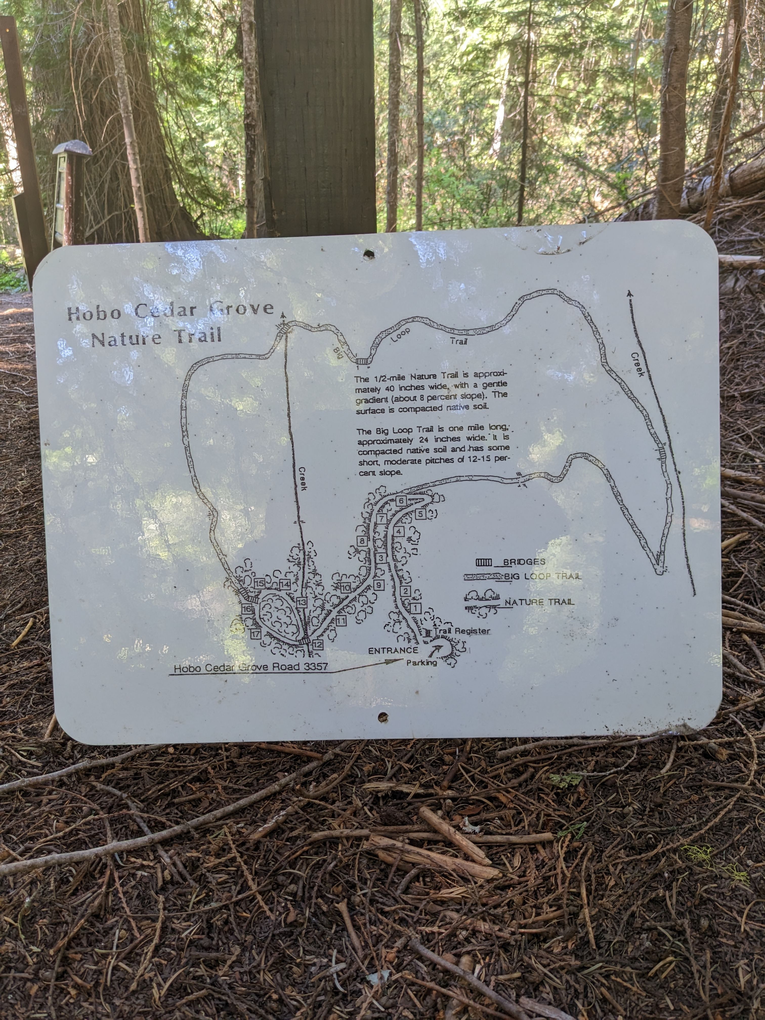 There are two loops within the grove. For the big loop, there are a few benches that one can sit at and take a rest after some of the steeper climbs. Massive cedar trees can be visible all around, and the trail comes close to the eastern creek and passes over the western creek, offering a bit of refreshment for pets along the way. I cannot be sure that the creeks flow year round, but they have been flowing both times that I have been up there. There are signs along the nature trail that are useful for educating the hiker on what they are looking at and how the unique ecosystem works.