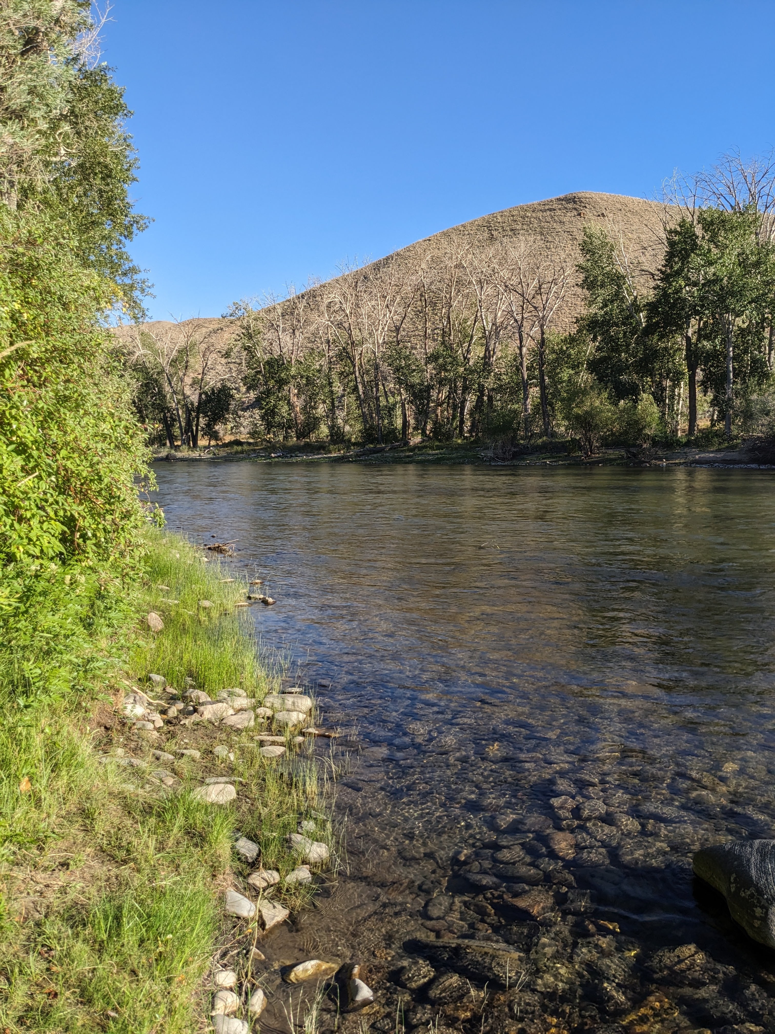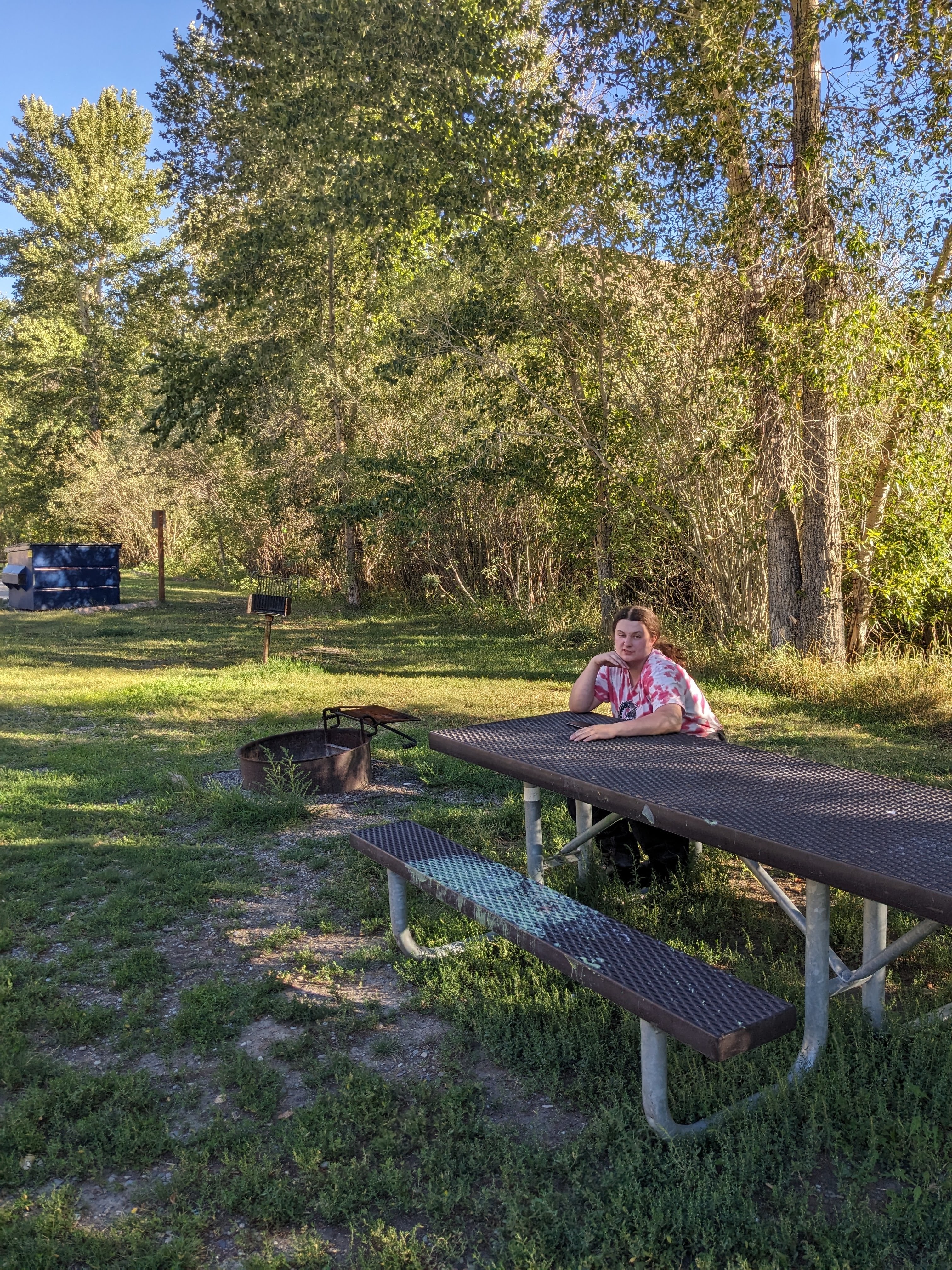 Not far south of Challis, we found the Bayhorse Recreation Site. It looked most promising, with few other campers, potable water, and vault toilets. We found ourselves a nice little spot for camp and after a short respite, we sat about getting the tents set up. With camp established, Megan explored the river and I enjoyed a little chat with our neighbor.
