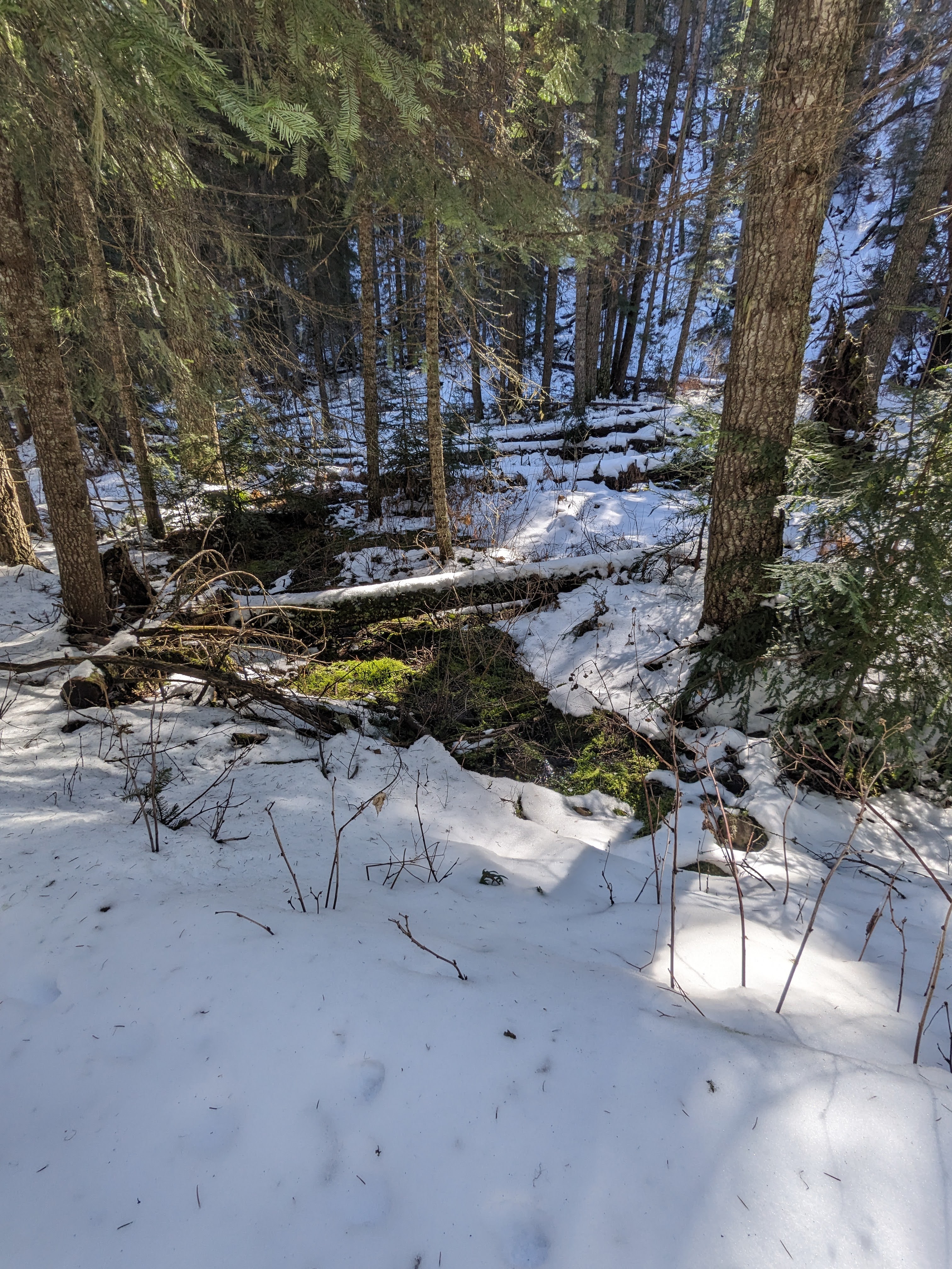 The portion of the trail that we hiked had some up and downs to it, but nothing really serious. Asides from the downed trees across the trail, it was a very nice path. As this trail is a multi-use, OHV trail, it was decently wide and smooth. Of course, it is hard to make this claim when the trail was covered in snow, but I did not see portions where there were large rocks or deep ruts in the trail. From what I was able to find about the trail, the first three miles follows near to the creek, which offers a great deal of ambiance and tree growth. After this point it apparently gains elevation quickly as it ascends to the Godman area.